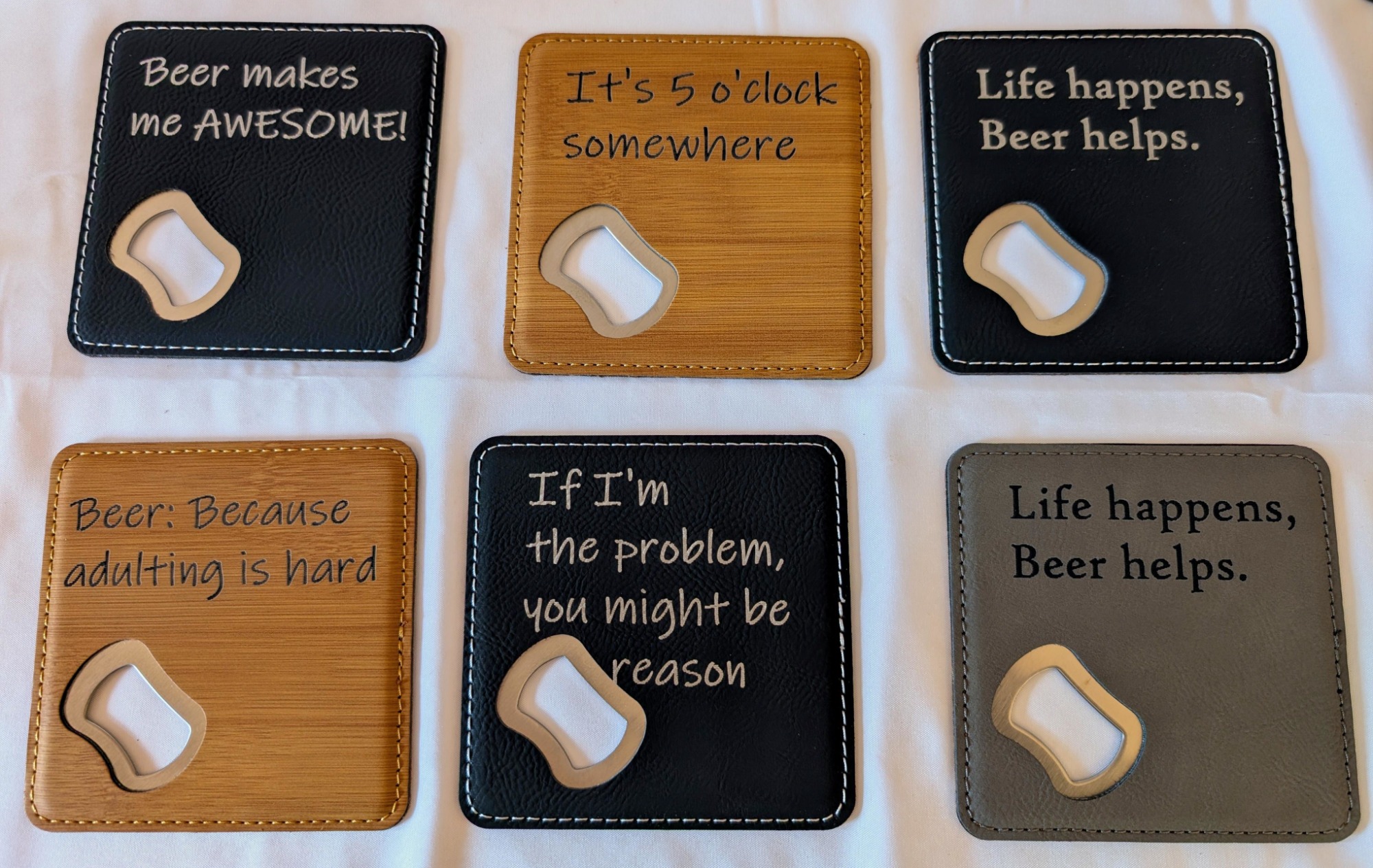 Our Barware collection includes premium slate and leatherette coasters, as well as flasks. These items can be customized with images, words, logos or personalized with names or monograms. We are only limited by your imagination!